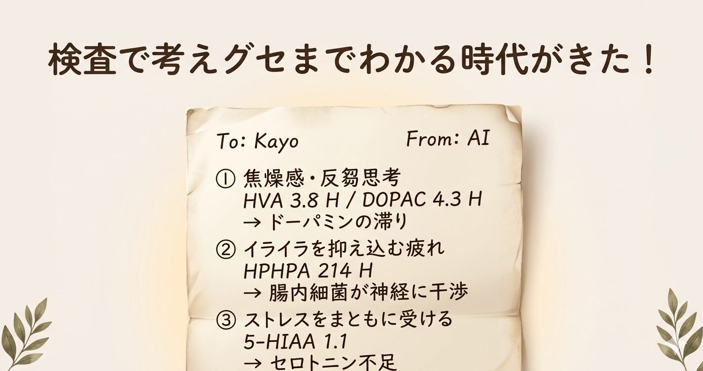 有機酸検査に現れたドーパミン代謝の滞りとクロストリジア菌の影響が、「焦燥感」「反芻(ぐるぐる)思考」「感情の抑え込み疲れ」を生み出していた可能性がある、と。